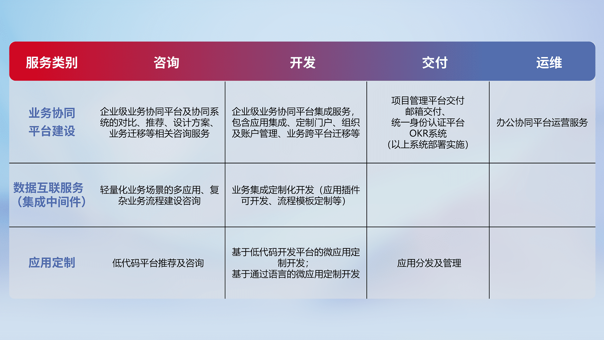 针对钉钉、、、、企微、、、、IDaas等平台级产品提供产品的规划、、、、方案、、、、交付、、定制化开发等服务,,实现如统一协同办公、、智能客户服务、、、混合会议管理、、智能数据查询、、等业务场景,,实现数字化转型。。。。